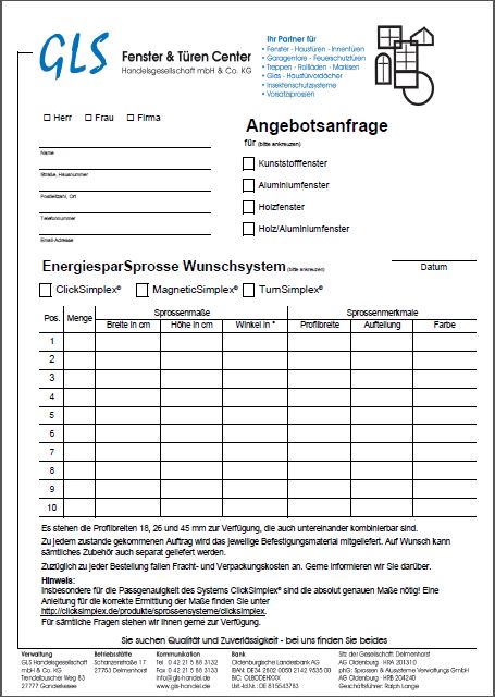 Hier finden Sie unsere Angebotsanfrage, in die Sie ganz übersichtlich alle Maße und Daten für Ihre neuen WunschSprossen eingeben können. Dieses Formular können Sie dann online an uns absenden und sich selbst eine Kopie davon speichern oder ausdrucken. Es ist ganz einfach und unverbindlich für Sie!